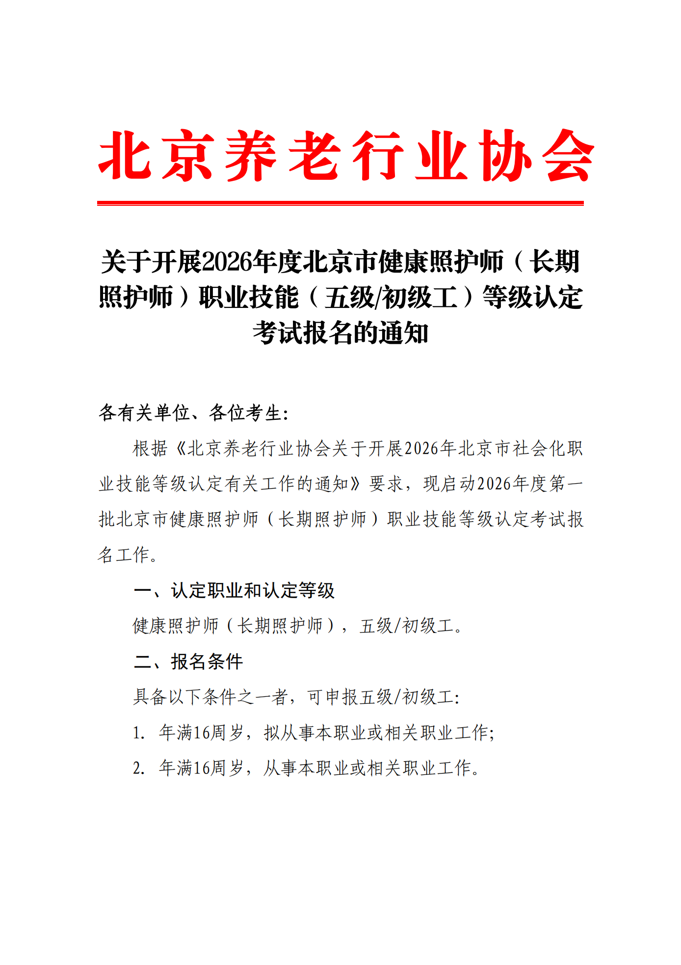 关于开展2026年度北京市健康照护师(长期照护师)职业技能(五级/初级工)等级认定考试报名的通知
